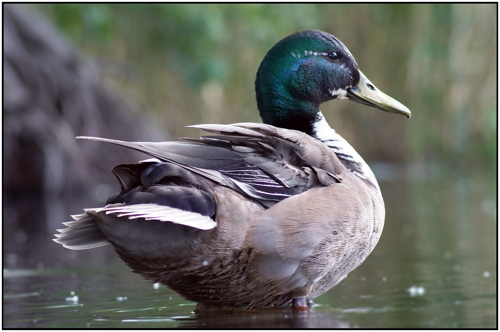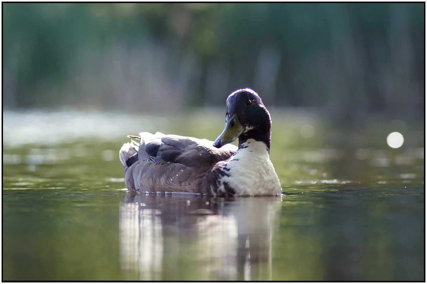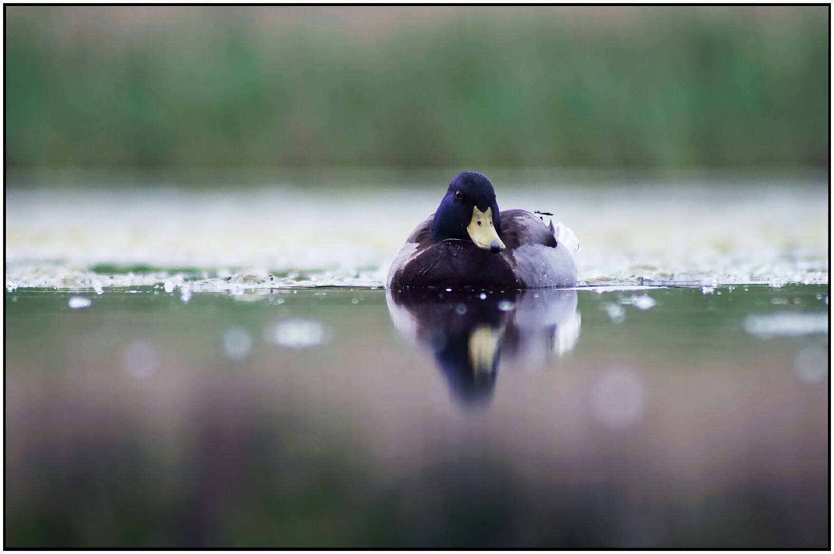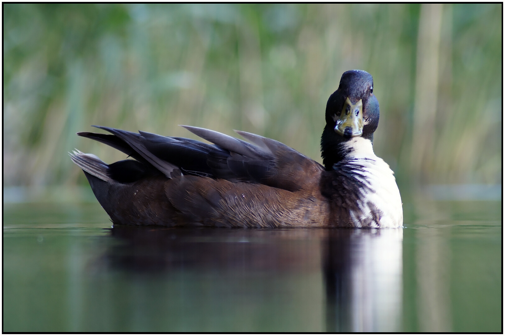 Jest dużym ptakiem wodnym z rodziny kaczkowatych. W okresie godowym i lęgowym, samiec jest kontrastowo upierzony. Głowa ciemno zielona z metalicznym połyskiem dziób żółty, nogi pomarańczowe.