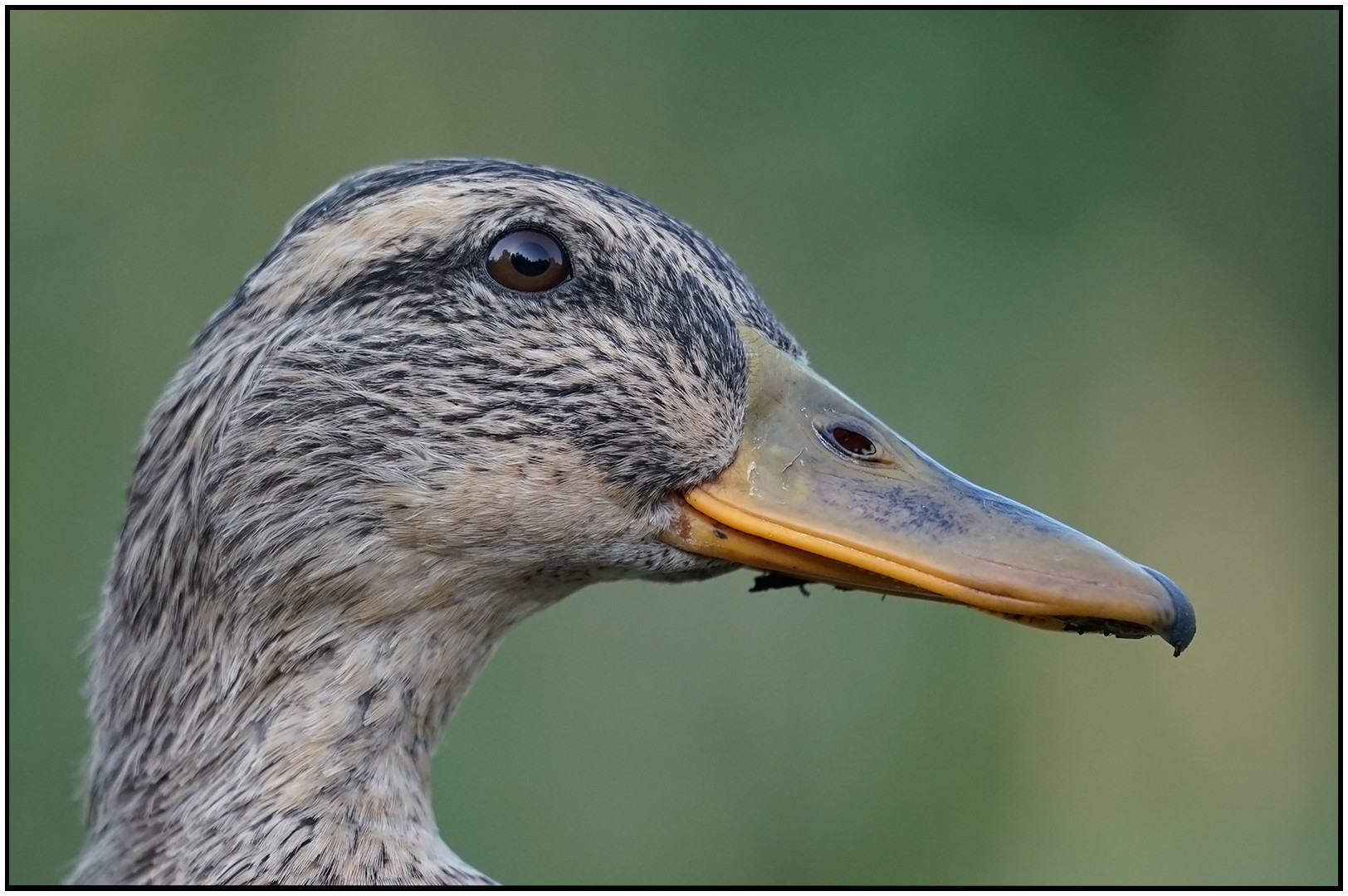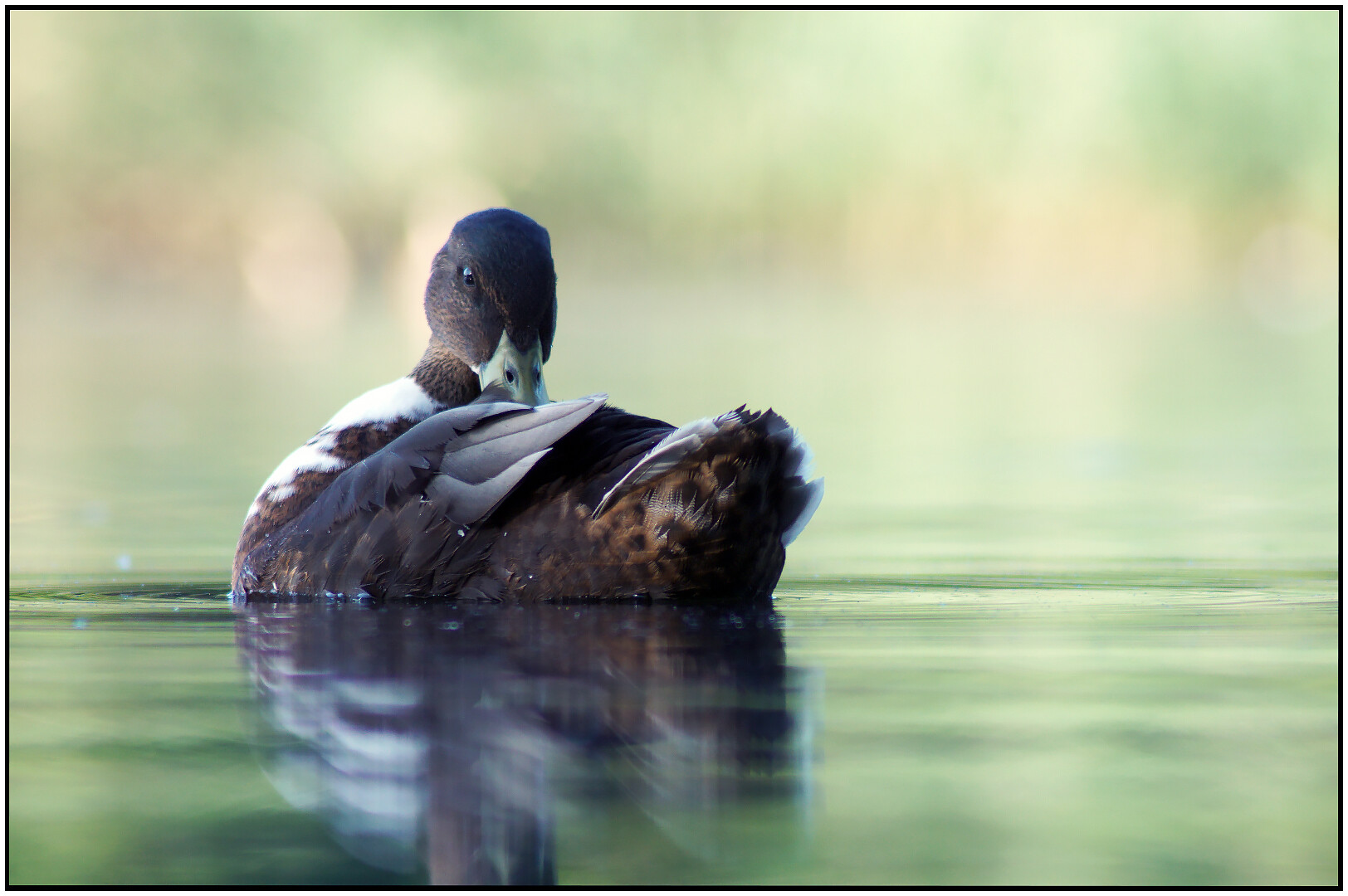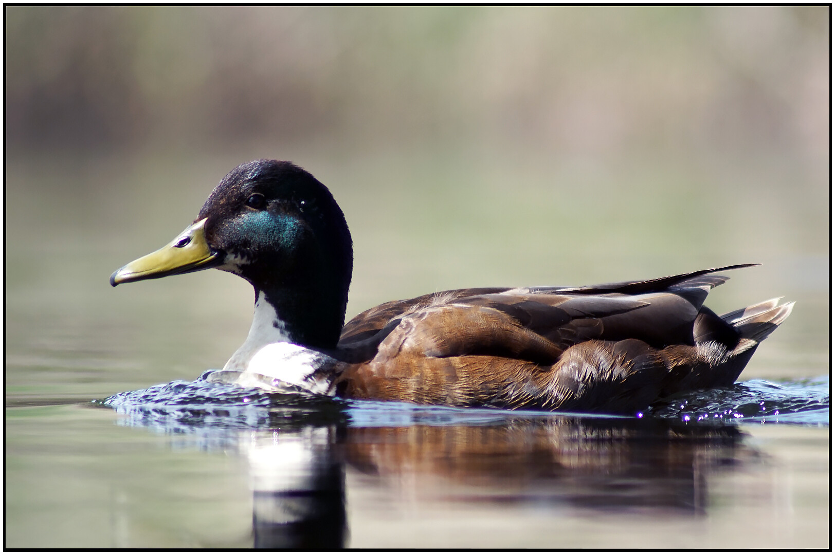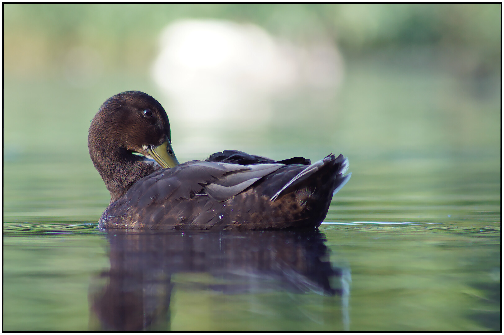 Jest dużym ptakiem wodnym z rodziny kaczkowatych. W okresie godowym i lęgowym, samiec jest kontrastowo upierzony. Głowa ciemno zielona z metalicznym połyskiem dziób żółty, nogi pomarańczowe.